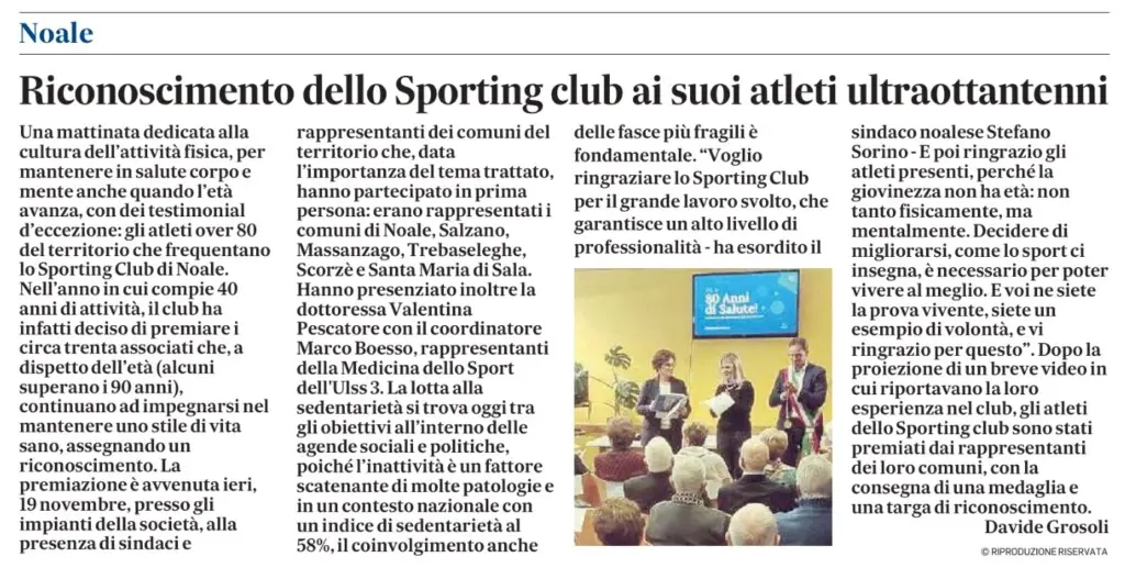Martedì 19 novembre 2024, lo Sporting Club Noale ha celebrato una giornata unica e ricca di emozioni: l’evento “Più di 80 anni di Salute – Celebriamo gli eroi senior del nostro club”, organizzato nell’ambito dei festeggiamenti per i nostri 40 anni di attività.